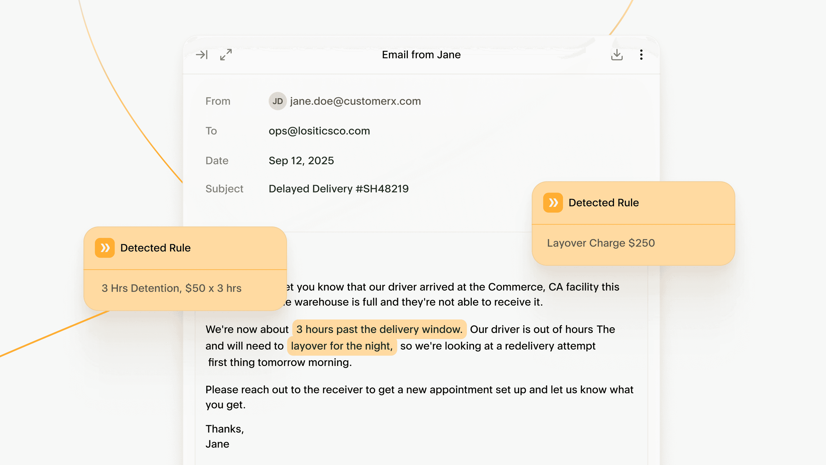 Tally ingests the semantics of email communications in real time, identifying exceptions, discrepancies, and approvals as they happen and matching them to the relevant shipment. When an exception occurs, it's captured with full context, not reconstructed from memory a week later when a customer pushes back.
